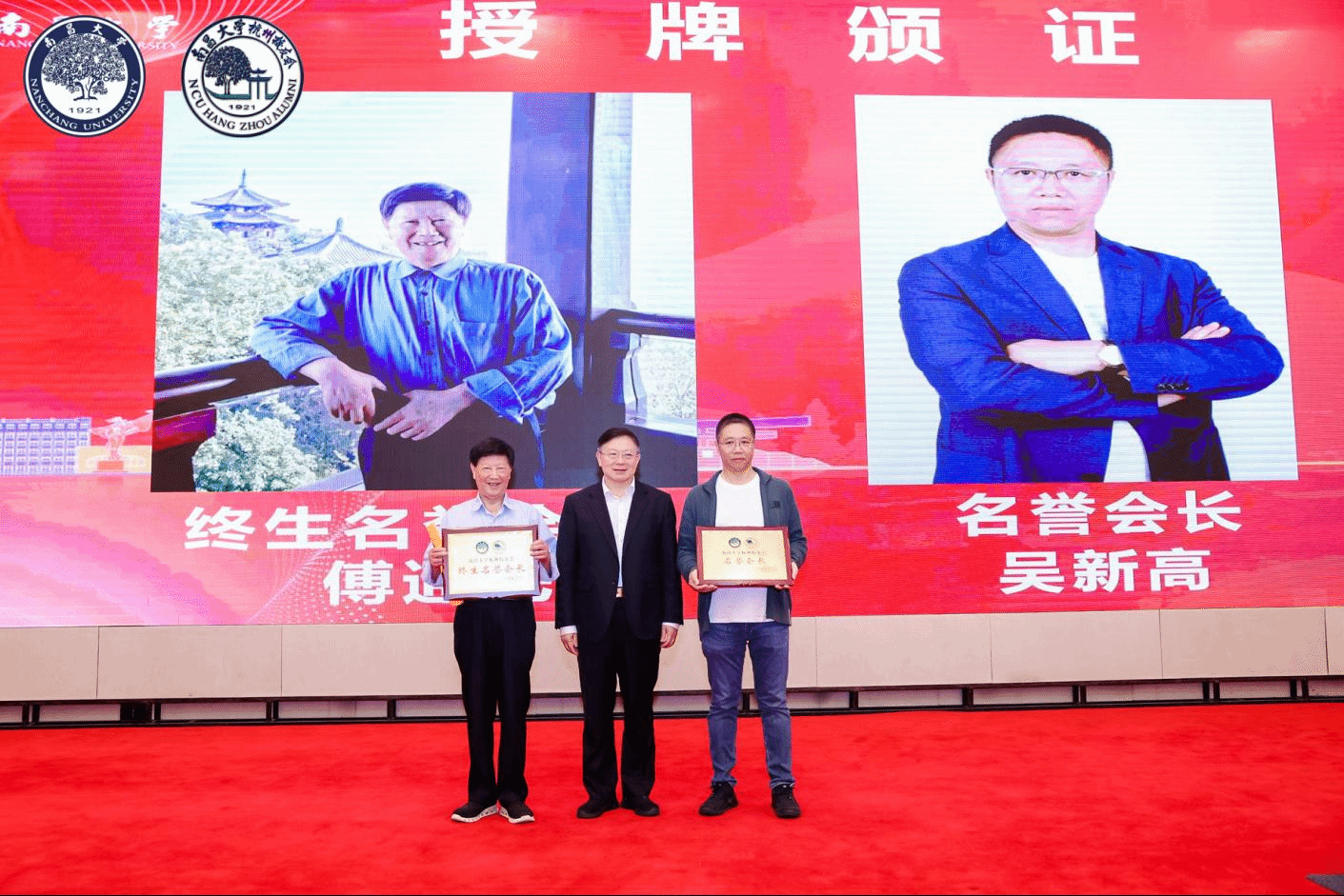羅嗣海向新當選的校友會會長劉海兵授牌“南昌大學杭州校友之家”,并為南昌大學杭州校友會終身名譽會長傅通先、名譽會長吳新高授牌。