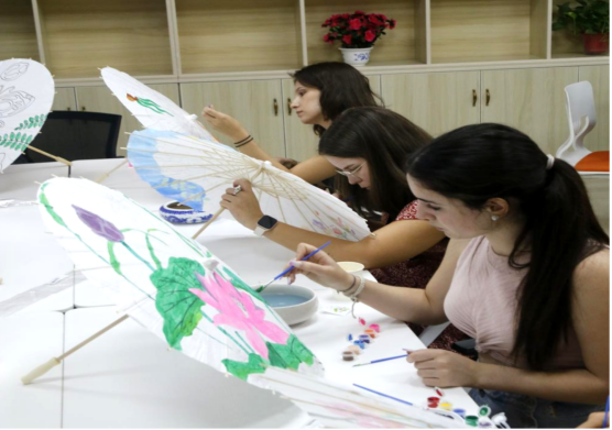 本次夏令營以漢語文化為主題,根據營員的中文水平和學習意向,除漢語強化課程外,還開展了學畫中國畫,經典詩詞賞析,學唱中國歌等文化體驗活動。語言課程將趣味性與實用性相結合,圍繞在華期間實用話題展開。文化課程突出體驗性與互動性,展示了中華優秀傳統文化的無窮魅力。本次夏令營特別設置了“非遺手工體驗”活動:寓意吉祥的百福圖,清麗溫婉的油紙傘,含義豐富的京劇臉譜,親手縫制的生肖香包,無不讓營員們親身體驗到了傳承與發展中的中華優秀傳統藝術。